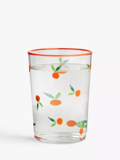 Glass with orange fruit pattern, machine screen printed with organic inks.